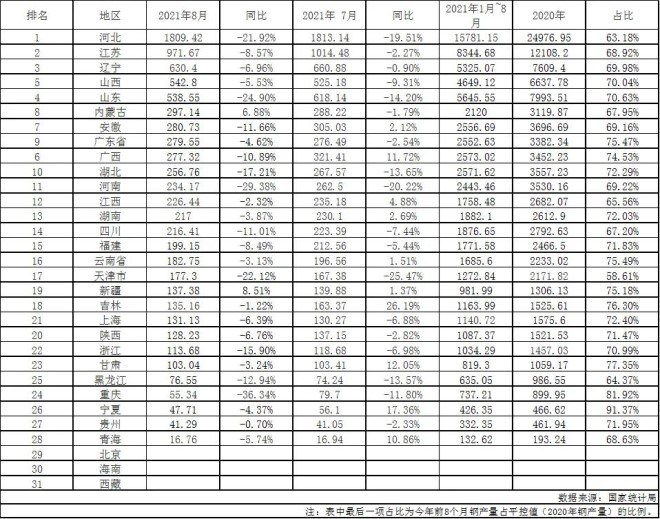 表1:2021年7月、8月份中国大陆各地粗钢产量表(单位:万吨)