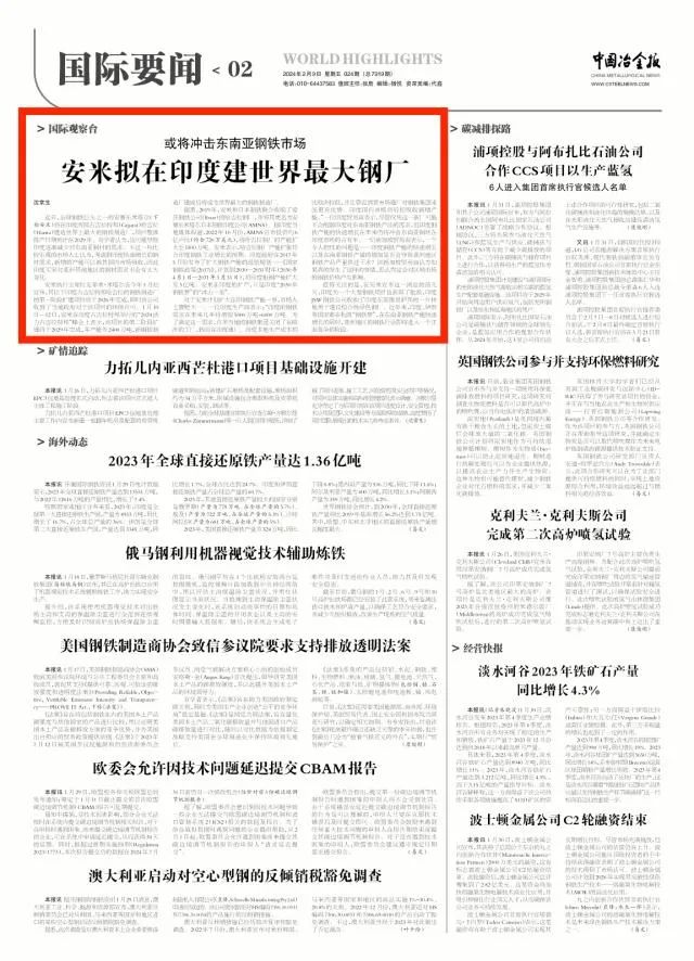 安米执行主席拉克希米·米塔尔在今年1月初宣布,其位于印度古吉拉特邦哈吉拉的钢铁制造厂的第一阶段扩建项目将于2026年完成,同时该公司收到了当地政府对于该项目的环保许可。1月10日—12日,安米在印度古吉拉特邦举行的“2024活力古吉拉特邦”峰会上表示,该项目的第二阶段扩建将于2029年完成,年产能为2400万吨,新钢铁制造厂建成后将成为世界最大的钢铁制造厂。