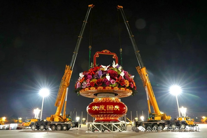 ▲9月23日清晨,经过5个夜晚的奋战,2025年国庆节前夕,天安门广场主题花篮惊喜亮相、繁花绽放。2025年是首钢建设钢构分公司连续第18年承担国庆天安门主题景观花篮的制作安装任务。18年来,首钢建设克服各种困难,零差错圆满完成各项施工任务,在天安门广场为共和国献礼。图为安装现场。(许心 摄)