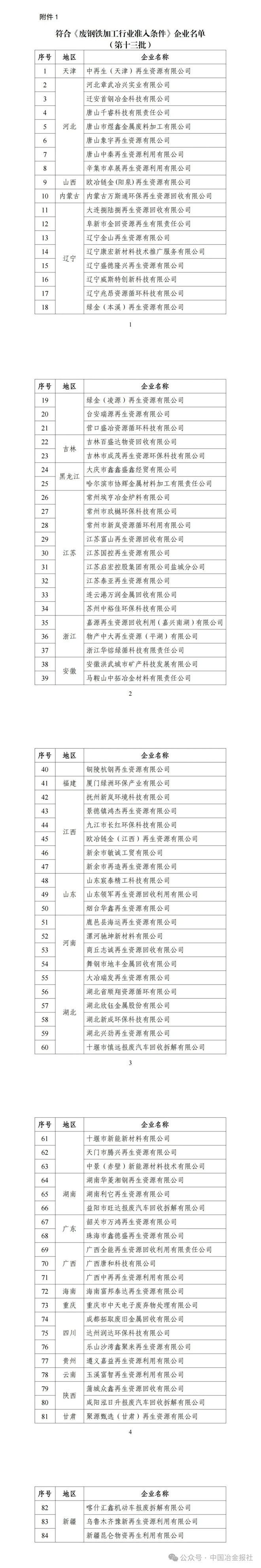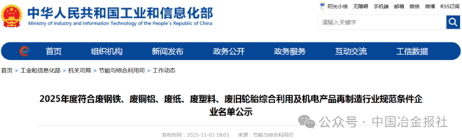 11月3日,工信部发布《2025年度符合废钢铁、废铜铝、废纸、废塑料、废旧轮胎综合利用及机电产品再制造行业规范条件企业名单公示》。从中获悉,新增84家符合废钢铁加工行业准入条件的企业。