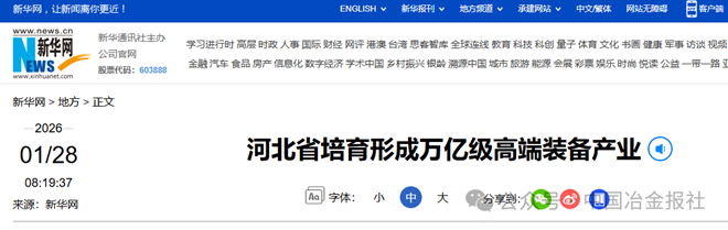 1月27日,新华网发布《河北省培育形成万亿级高端装备产业》一文。