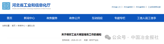 3月19日,河北省工业和信息化厅官网发布了《关于做好工业大模型培育工作的通知》(以下简称通知)。