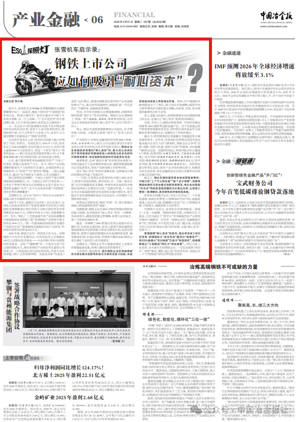 中央财经大学绿色金融国际研究院ESG(环境、社会、公司治理)中心联合主任包婕在接受《中国冶金报》记者采访时结合其多年的研究指出,钢铁企业在争取政府背景的“耐心资本”时,最大的认知误区在于将环境保护和碳减排投入纯粹视为成本负担和外部强制要求,而非战略性投资和市场差异化机会。