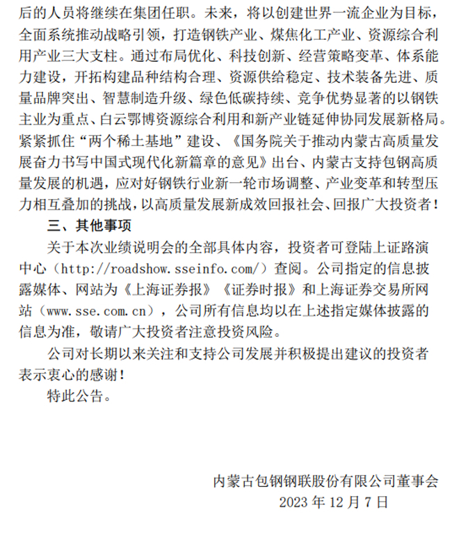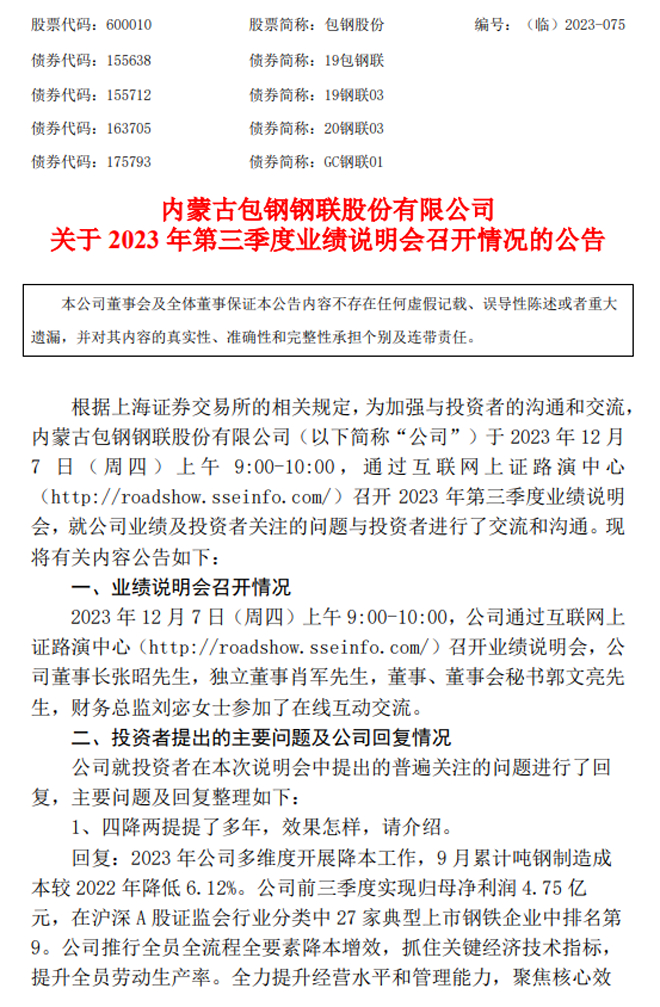 包钢股份:包钢股份关于2023年第三季度业绩说明会召开情况的公告