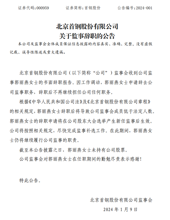 首钢股份:北京首钢股份有限公司关于监事辞职的公告