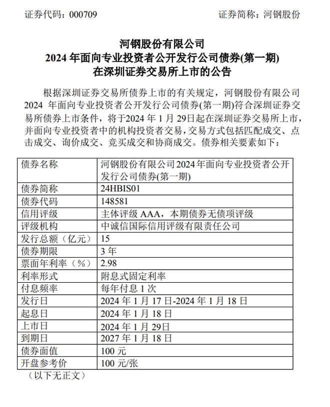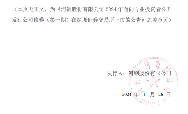 河钢股份:河钢股份有限公司2024年面向专业投资者公开发行公司债券(第一期)在深圳证券交易所上市的公告