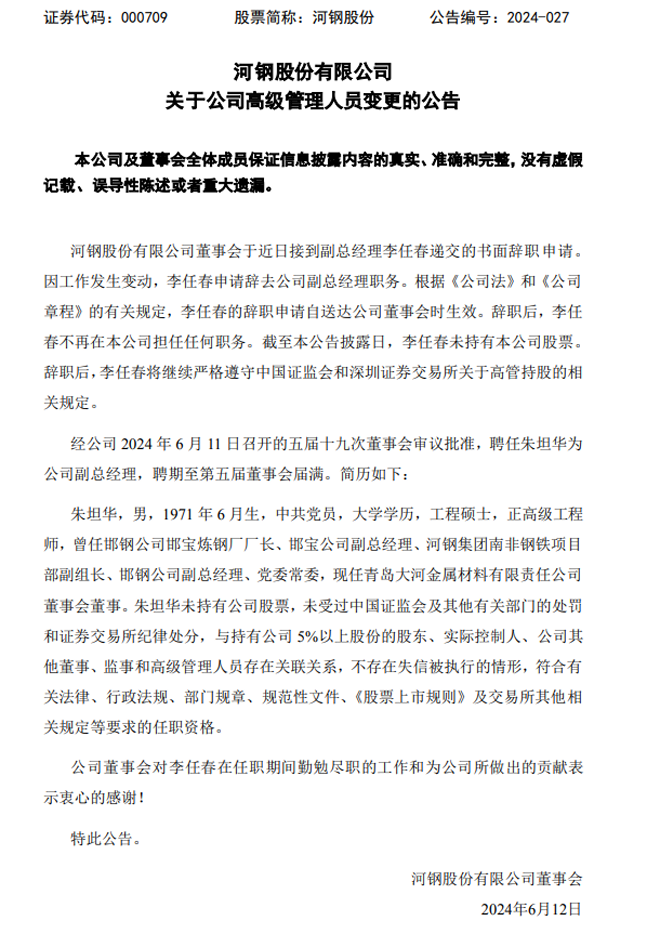 河钢股份:关于公司高级管理人员变更的公告