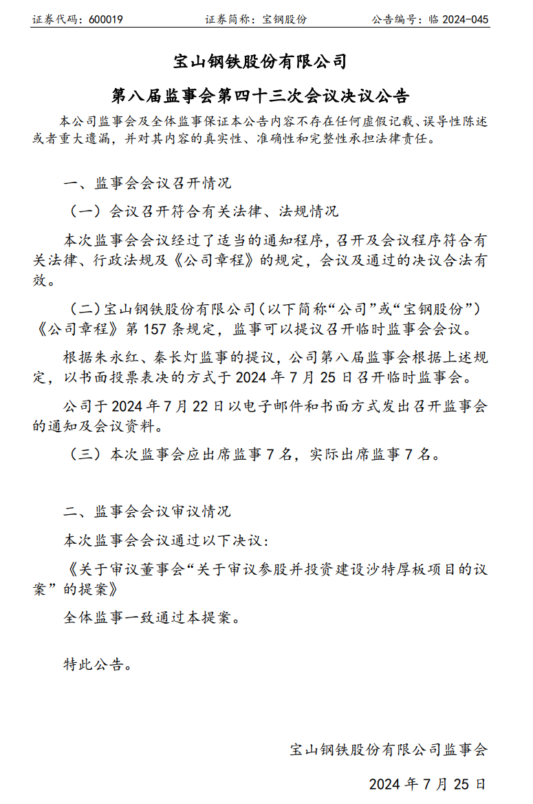宝钢股份:宝钢股份第八届监事会第四十三次会议决议公告