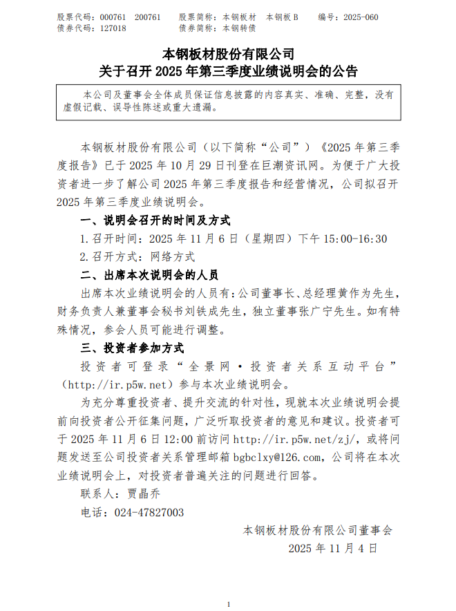 本钢板材:本钢板材股份有限公司关于召开2025年第三季度业绩说明会的公告