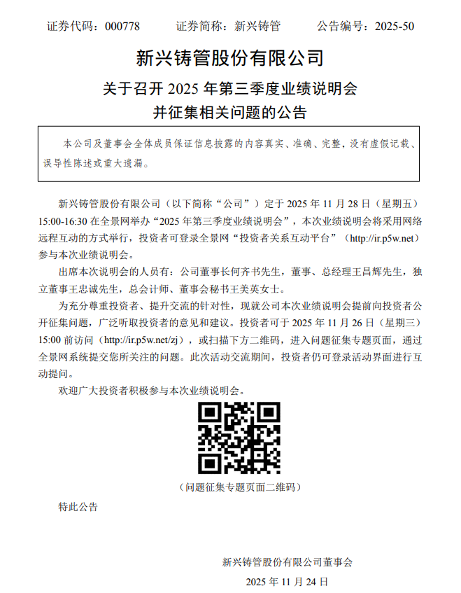 新兴铸管:关于召开2025年第三季度业绩说明会并征集相关问题的公告