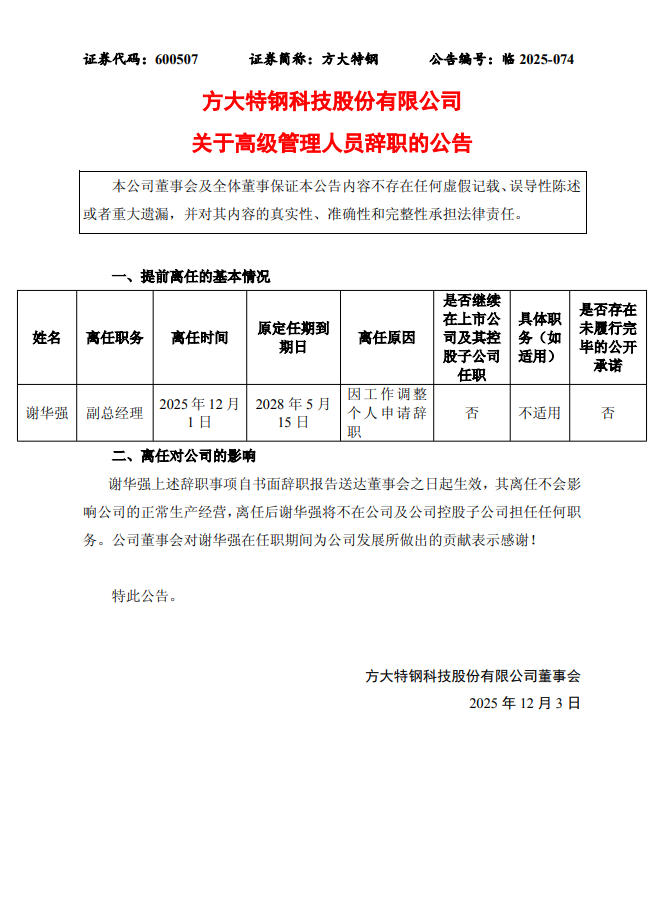 方大特钢:方大特钢关于高级管理人员辞职的公告