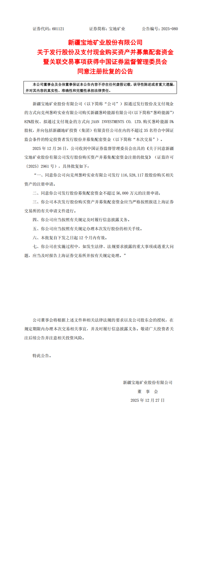 宝地矿业:新疆宝地矿业股份有限公司关于发行股份及支付现金购买资产并募集配套资金暨关联交易事项获得中国证券监督管理委员会同意注册批复的公告