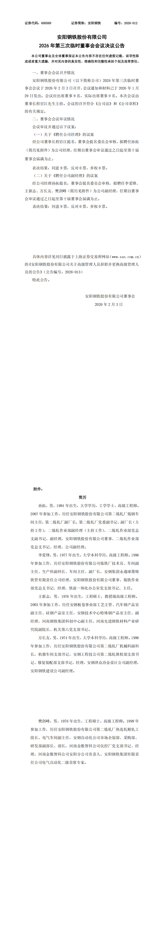 安阳钢铁:安阳钢铁股份有限公司2026年第三次临时董事会会议决议公告