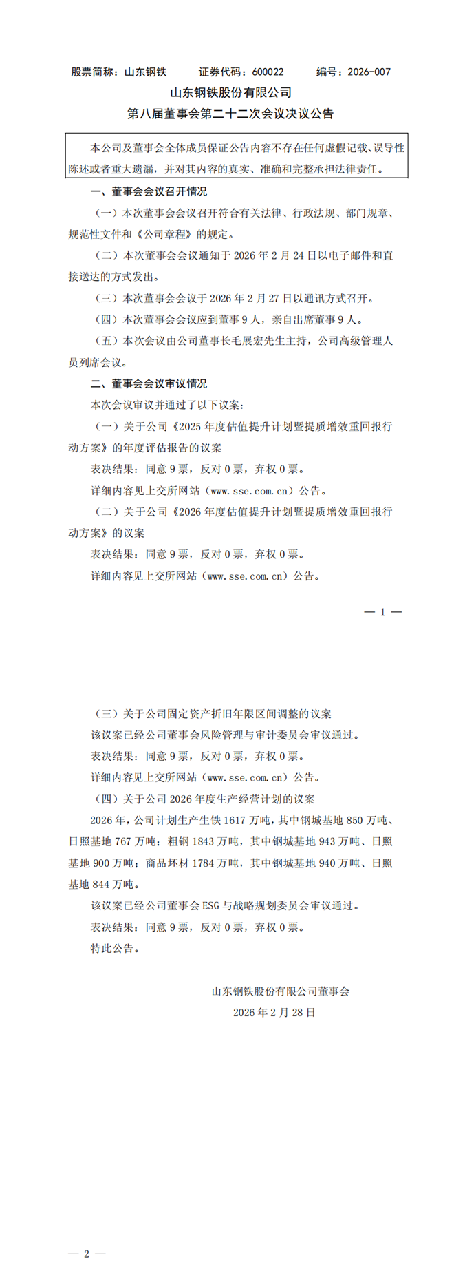 山东钢铁:山东钢铁股份有限公司第八届董事会第二十二次会议决议公告