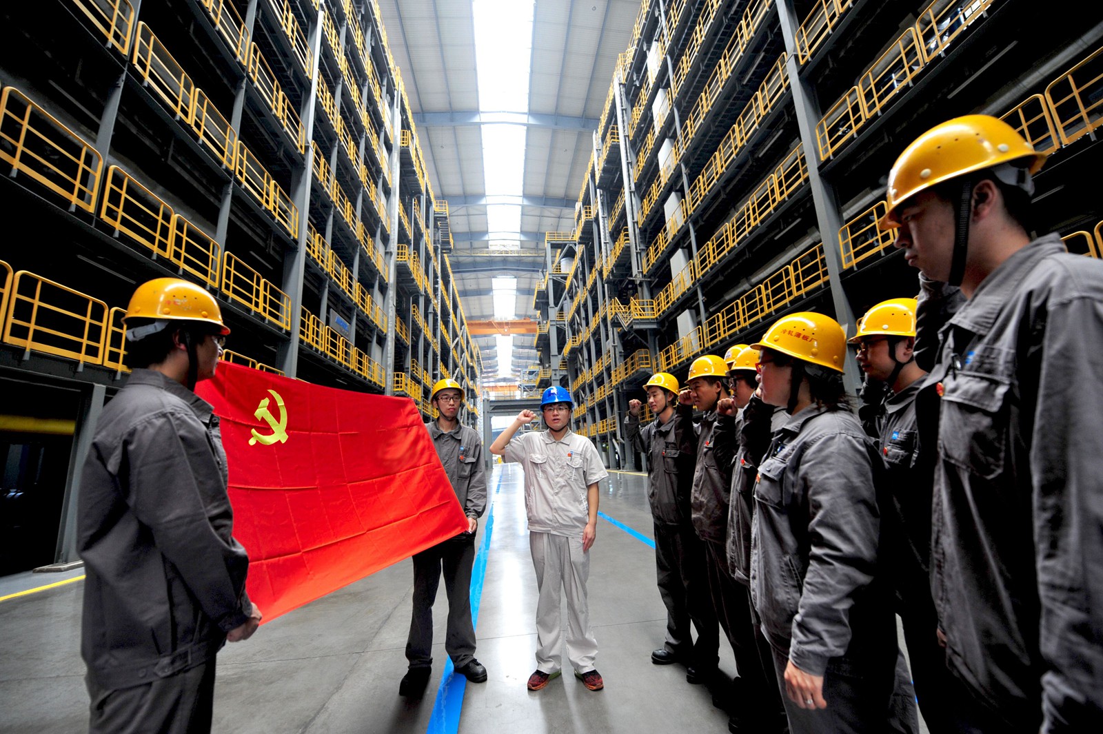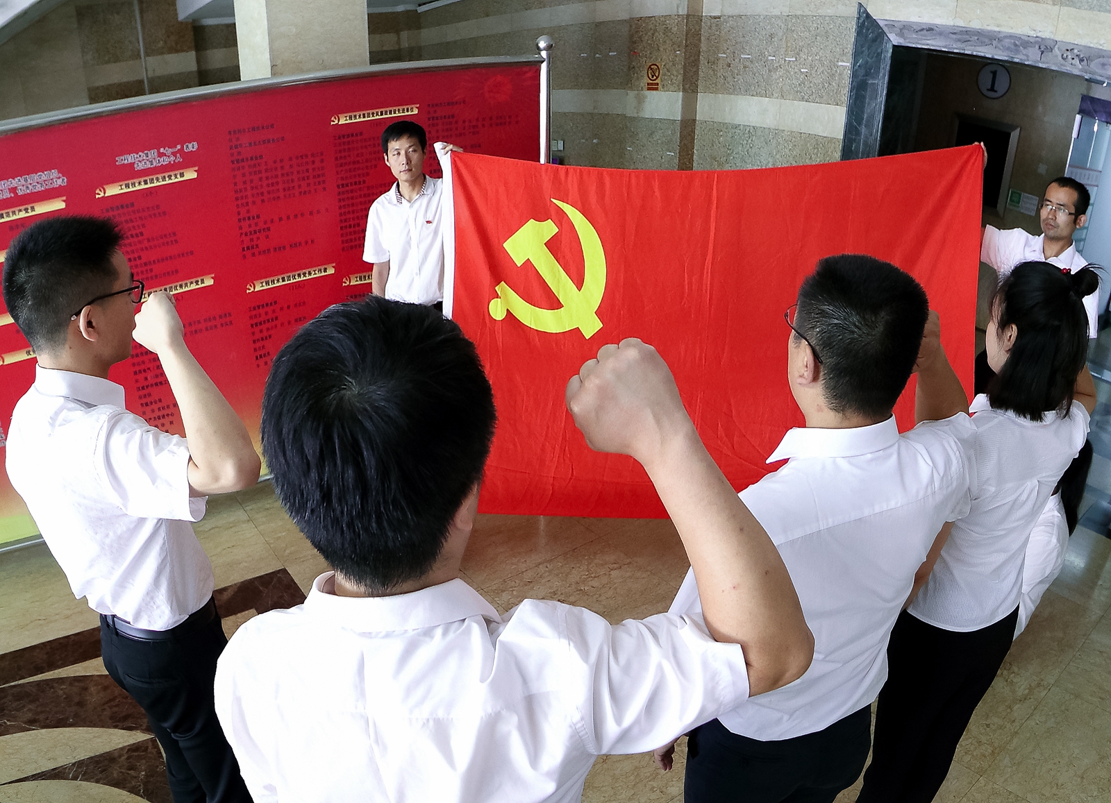 6月29日,中国宝武集团武钢工程技术集团公司开展纪念中国共产党建党96周年活动,广大党员高唱国歌向党的生日献上祝福、表达忠心,为企业发展再增干劲。图为该公司一批新党员向党旗立下铮铮誓言。(记者 朱旺春 摄)