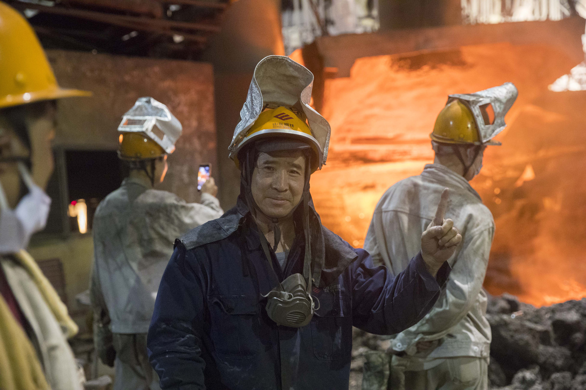 7月7日晚20时28分,济钢3号1750立方米高炉经过几个小时的预休风后,开启最后一炉出铁水,炉前工老吴伸出“1”的手势。