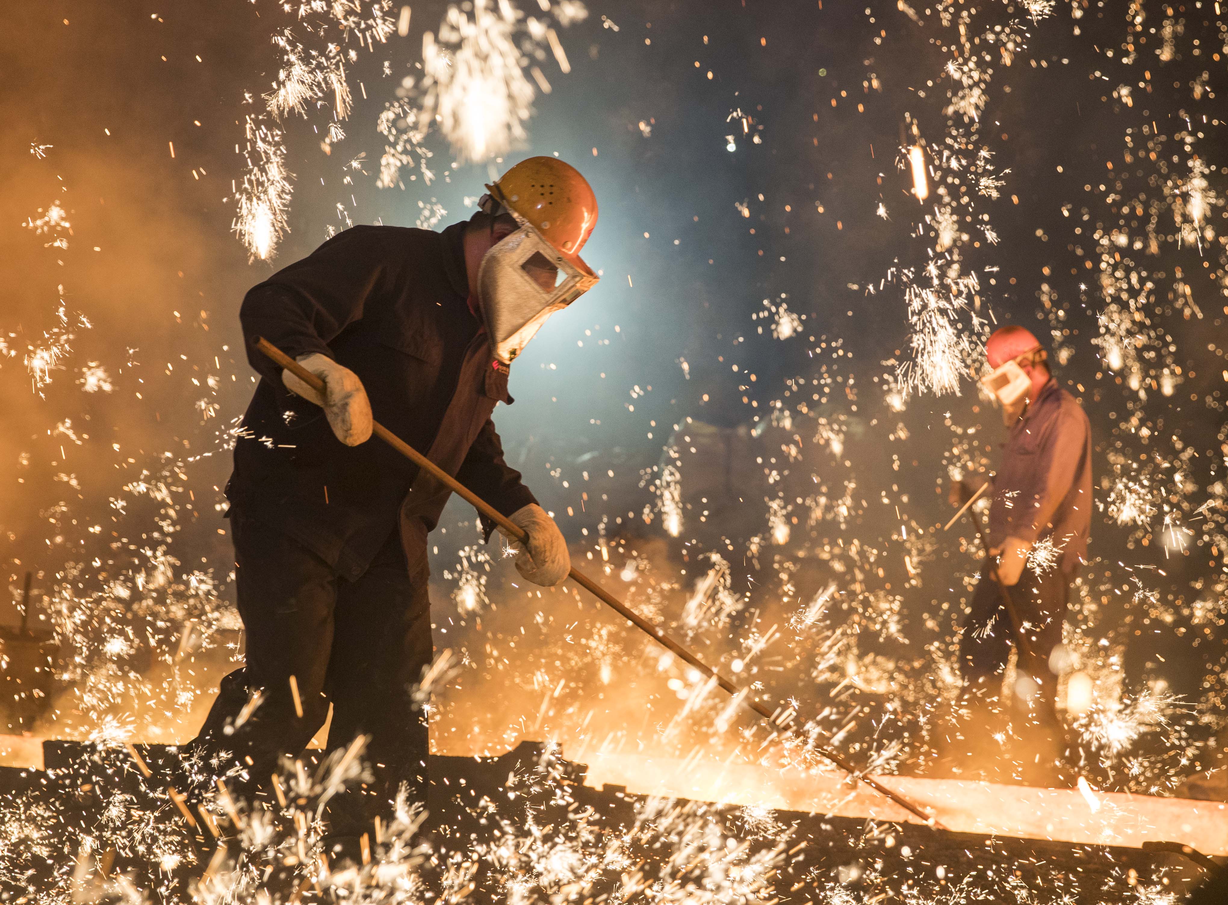 工人们在铸铁机旁浇铸的场景。