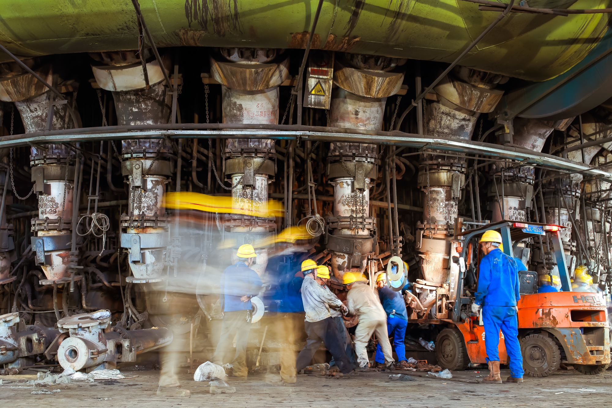 图为7月14日上午8时,职工们齐聚A座高炉风口平台,在叉车的配合下,挥舞大锤,将风口安装到位