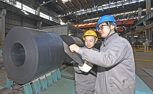 新年伊始,河钢唐钢一钢轧厂从加快产品结构调整和推进技术创新两方面发力,提升产线创效能力,确定1810生产线主打薄规格产品,全力推进半无头轧制技术在该产线落地。目前该产线已实现半无头轧制两分割的稳定生产,产线竞争力进一步提升。 图为河钢唐钢一钢轧厂技术人员和轧钢工一起检查半无头轧制后带钢横切面。(赵辉 褚兆青 摄影)