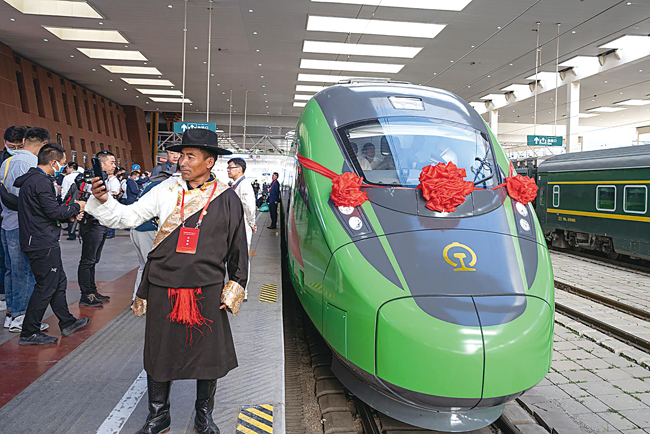 6月25日,“复兴号”高原内电双源动力集中型动车组从西藏拉萨站驶出,在同日开通的西藏首条电气化铁路——拉林铁路(拉萨市至林芝市)上投入运营。据了解,拉林铁路建设所用的5.4万吨高强度、高韧性、耐磨性好的稀土钢轨全部由包钢提供。图为“复兴号”动车组开动前,一位藏民在动车组前拍照留念。 (通讯员 丁庆斌/摄 记者 白立新/文)