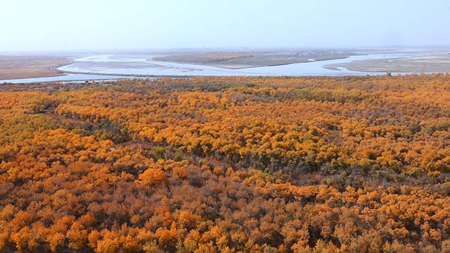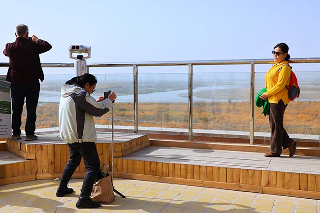 10月23日,一师十六团塔河源景区观光塔上远眺美景。景区位于塔里木河干流起点,是国家AAAA级旅游景区,也是第一师阿拉尔市“百里画廊”的起点。