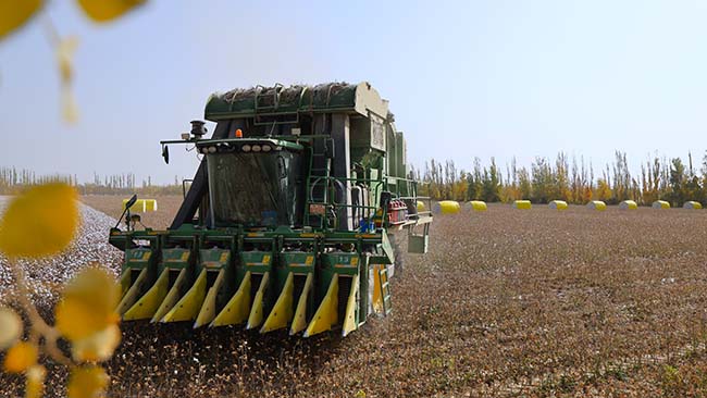 10月25日,一师十二团的大型机械化采棉机正在作业。2025年,一师通过全面实施干播湿出技术,抓实关键技术要求,预计棉花单产482.98公斤,较2024年增加29.9公斤。