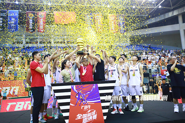 9月14日,在湖南省株洲市体育中心,湖南钢铁湘钢集团队以104∶75击败华为生态联队,夺得“厂BA”全国篮球邀请赛冠军。据悉,今年,“厂BA”首次设立全国邀请赛,成功吸引华为生态联队、欧菲光、广东奥普特、江西帮企陶瓷、江苏力沛电力等8支全国知名企业队伍参与,进一步拓展了赛事格局和影响力。图为湘钢集团代表队教练和队员共同捧起冠军奖杯。(贺意波/文 周阳/摄)