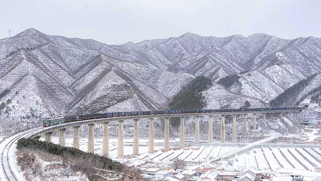 12月22日,河钢集团承德钒钛物流公司满载各类物资铁路列车正在通过滦河铁路特大桥(如图)。入冬后,河北承德地区连续降雪,承德钒钛物流公司迅速启动雪天铁路运输应急预案,加强重点岗位人员值班值守,确保张双铁路 专用线高效畅通,为企业生产所需原材料及城市燃油、供热物资保障供应奠定了坚实的运输基础。1月至11月份,该公司火车运输外发产品量同比提升32.84%。(陈洋/文 赵鹏/摄)