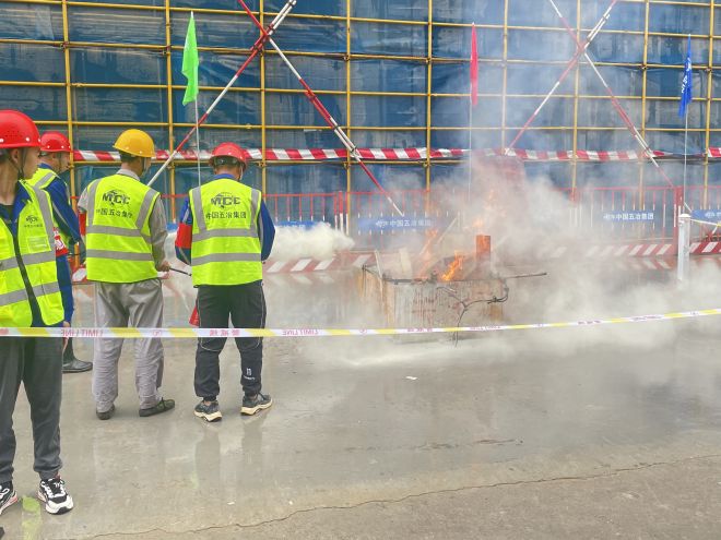 随后,项目现场开展了消防演练和高处坠落救援演练。演练首先模拟了因工人操作不当引发火灾,演练总指挥接到管理人员的火情报告后立即启动应急预案,组织进行抢险工作。在警戒疏散组、通讯组、抢险组以及后勤医疗组的密切配合下,“火势”迅速得到控制,火情被及时消除。与此同时,由于操作失误,一名工人从高处意外坠落,现场管理人员了解情况后第一时间上报事故情况。接到事故报告后,项目部立即展开高处坠落救援工作,第一时间疏散救援通道,联络救治医院,及时排除周边环境可能带来的二次伤害,并由专业人员进行初步救治,最终该名工人及时送至医院接受治疗。演练过程对接顺畅、有条不紊,达到了预期效果。