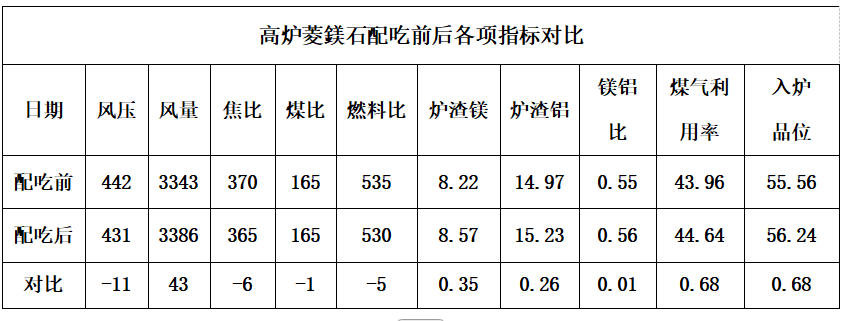 新金钢铁炼铁厂1080m³高炉通过每批料配吃0.55%(约吨铁10kg)菱镁石的工业实践,取得了兼具生产与成本的双重收益: