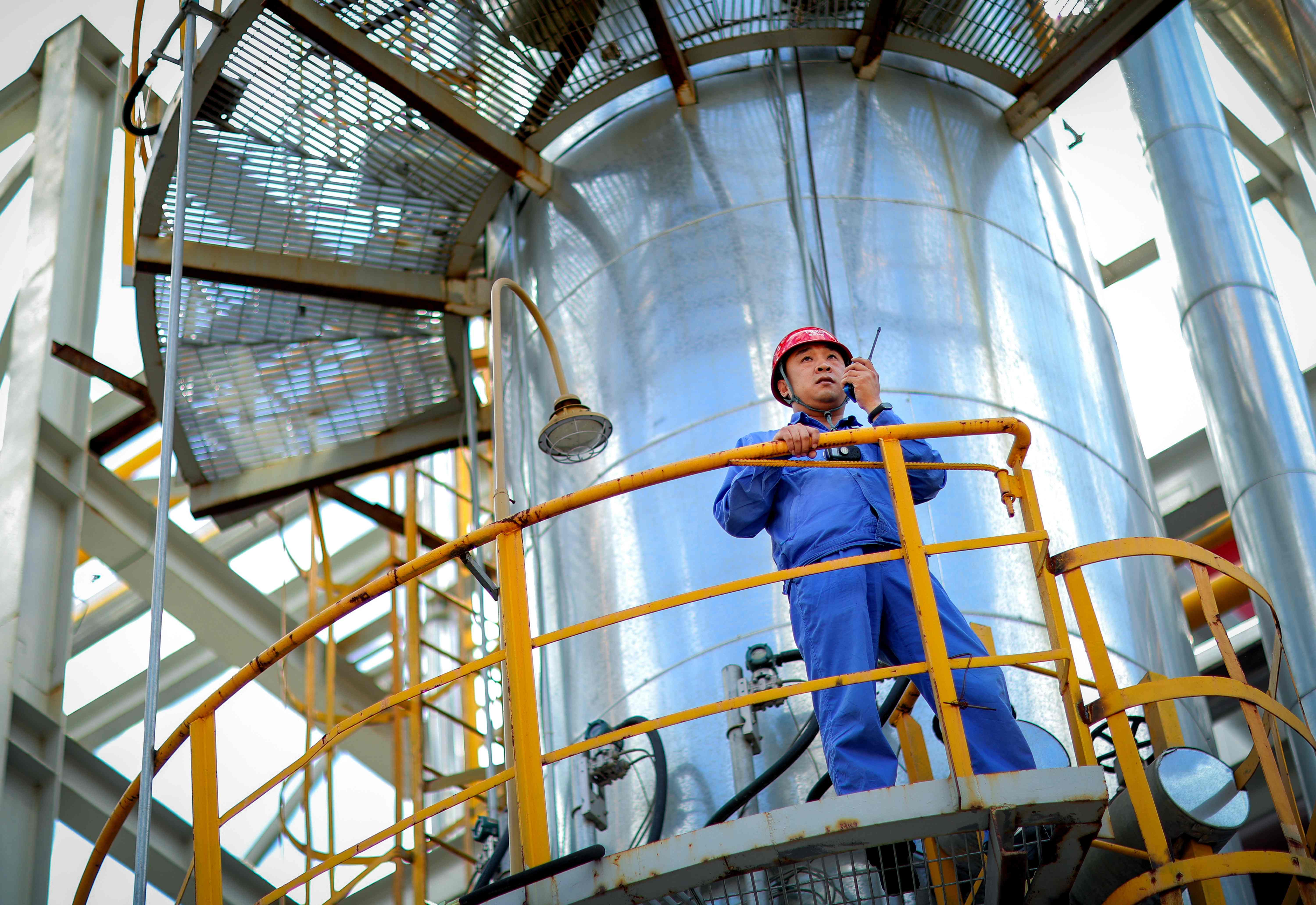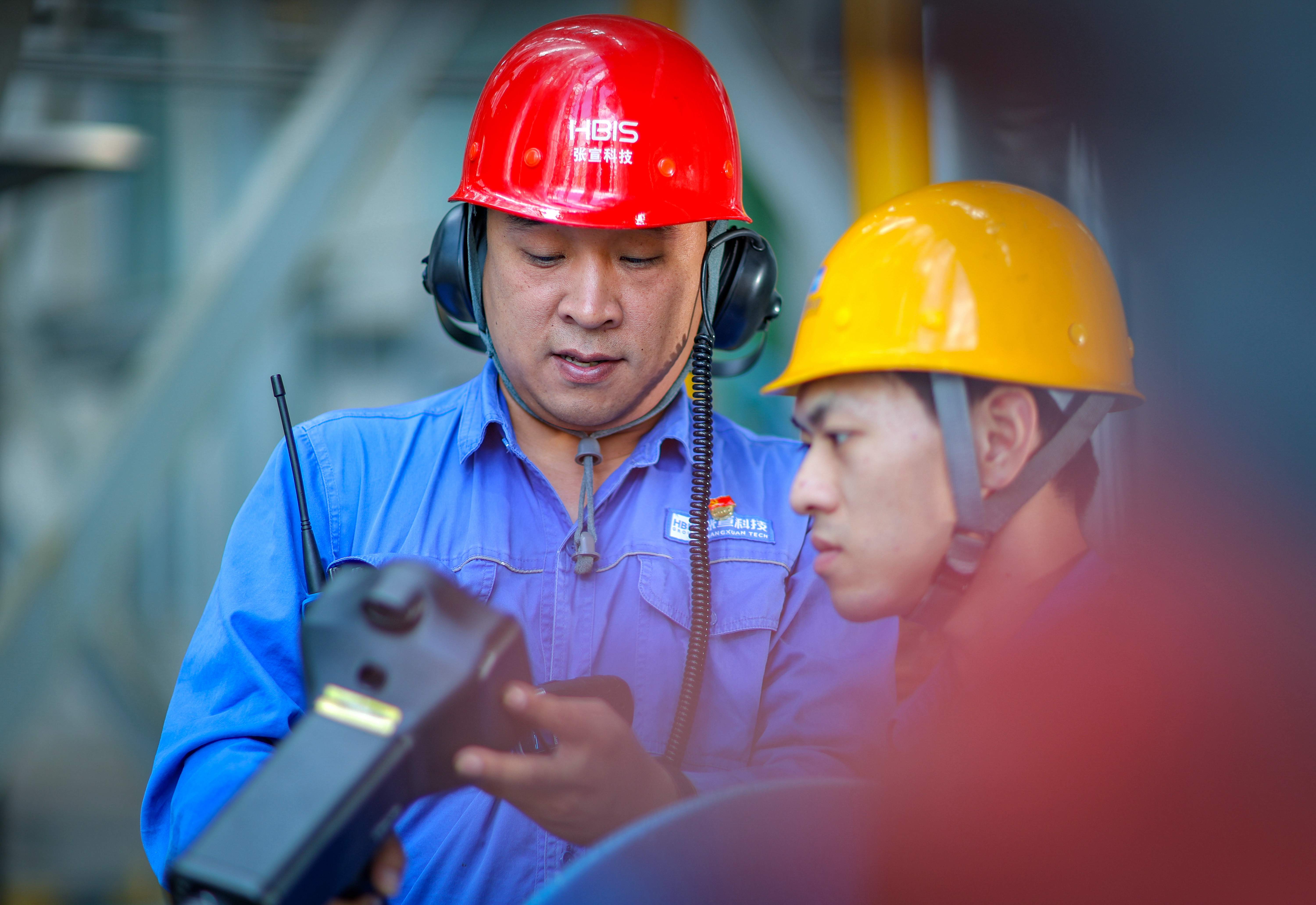 李利杰和团队在生产区域用超声波功能检测仪检测高温高压系统管道运行情况